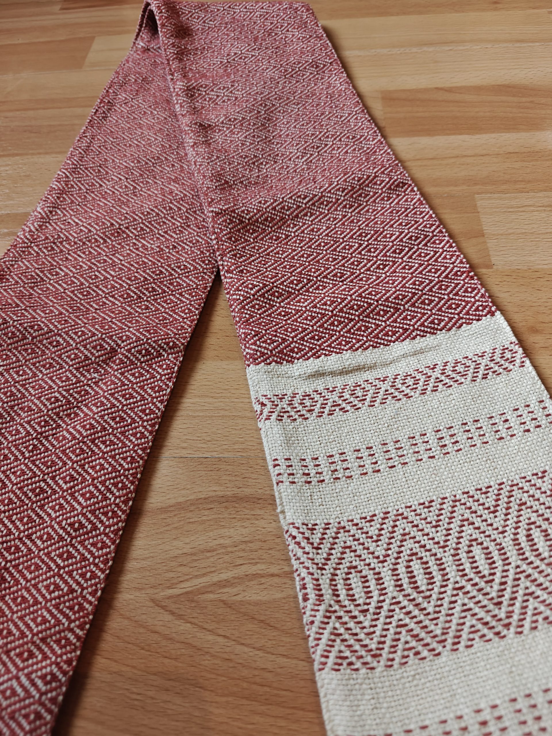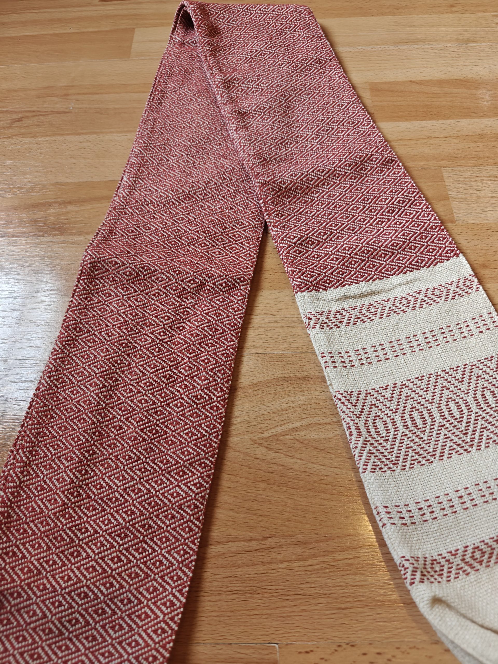 The length is around 2.8m, plus the plaits/fringes (which make tying easy), and around 15cm wide. These ones are a medium-weight: they weigh around 280-300gram.