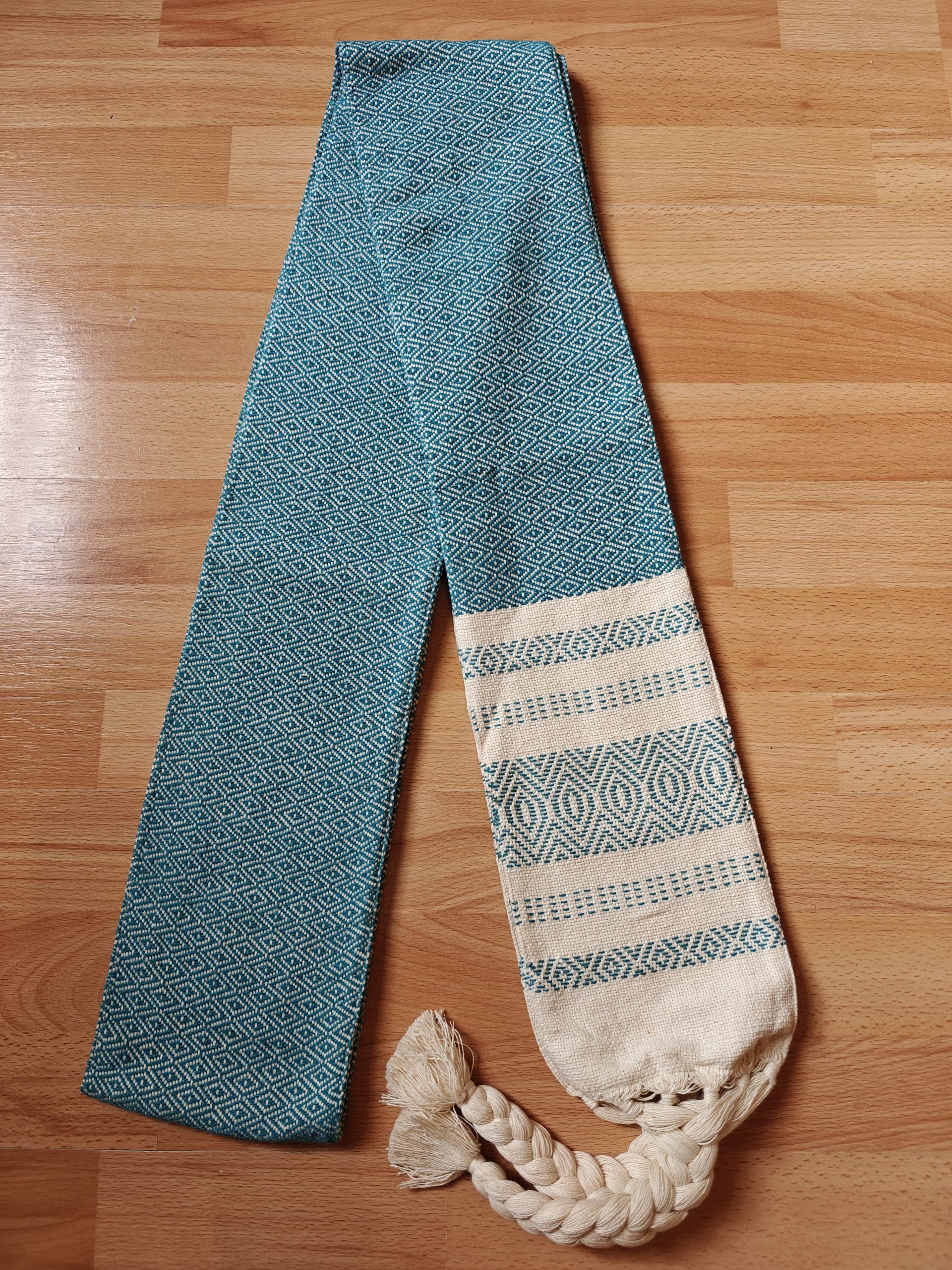 These traditional Fajas or Womb Belts are made out of double cotton fabric by artisans in Oaxaca in Mexico, to the design of the Colombian Chumbe. They wrap several times around the hips and the ends can then be tucked in or they can be tied with the plaits. The thick fabric has been woven on a pedal loom out of cotton, and the pieces are then sewn together from the edges to make it double the thickness of a normal rebozo – and have it give double the support!