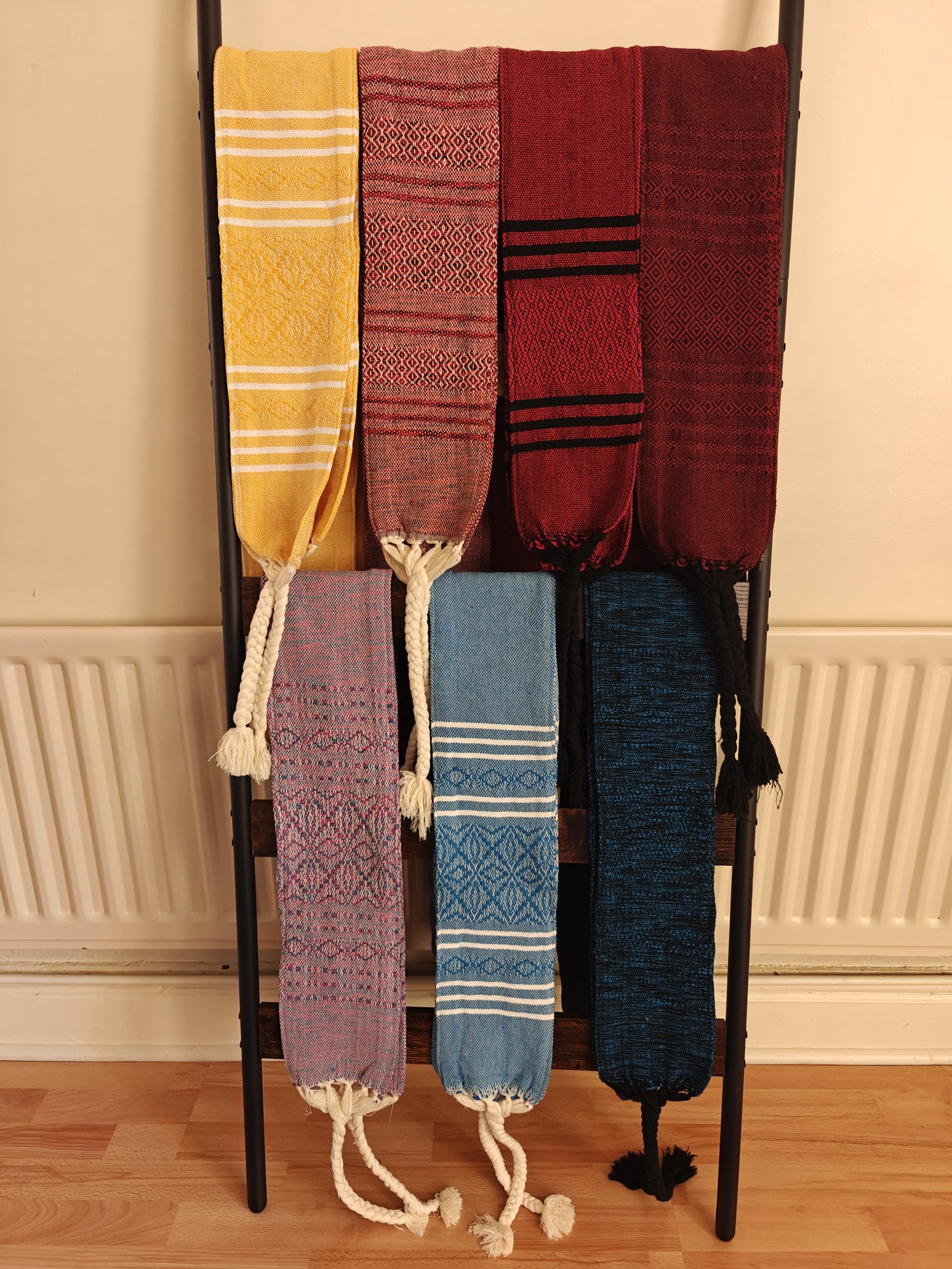 These traditional Fajas or Womb Belts are made out of double cotton fabric by artisans in Oaxaca in Mexico, to the design of the Colombian Chumbe. They wrap several times around the hips and the ends can then be tucked in or they can be tied with the plaits. The thick fabric has been woven on a pedal loom out of cotton, and the pieces are then sewn together from the edges to make it double the thickness of a normal rebozo – and have it give double the support!