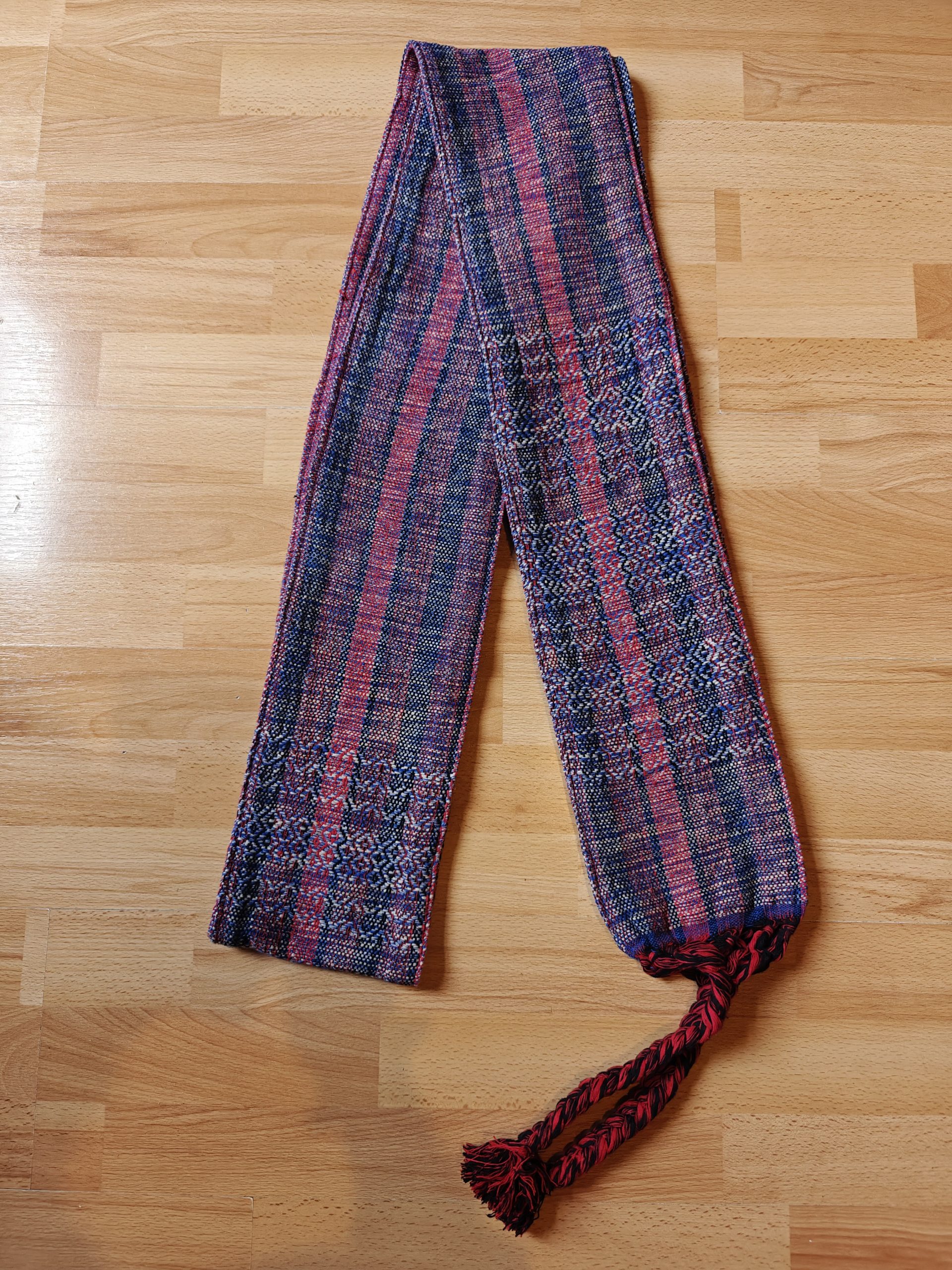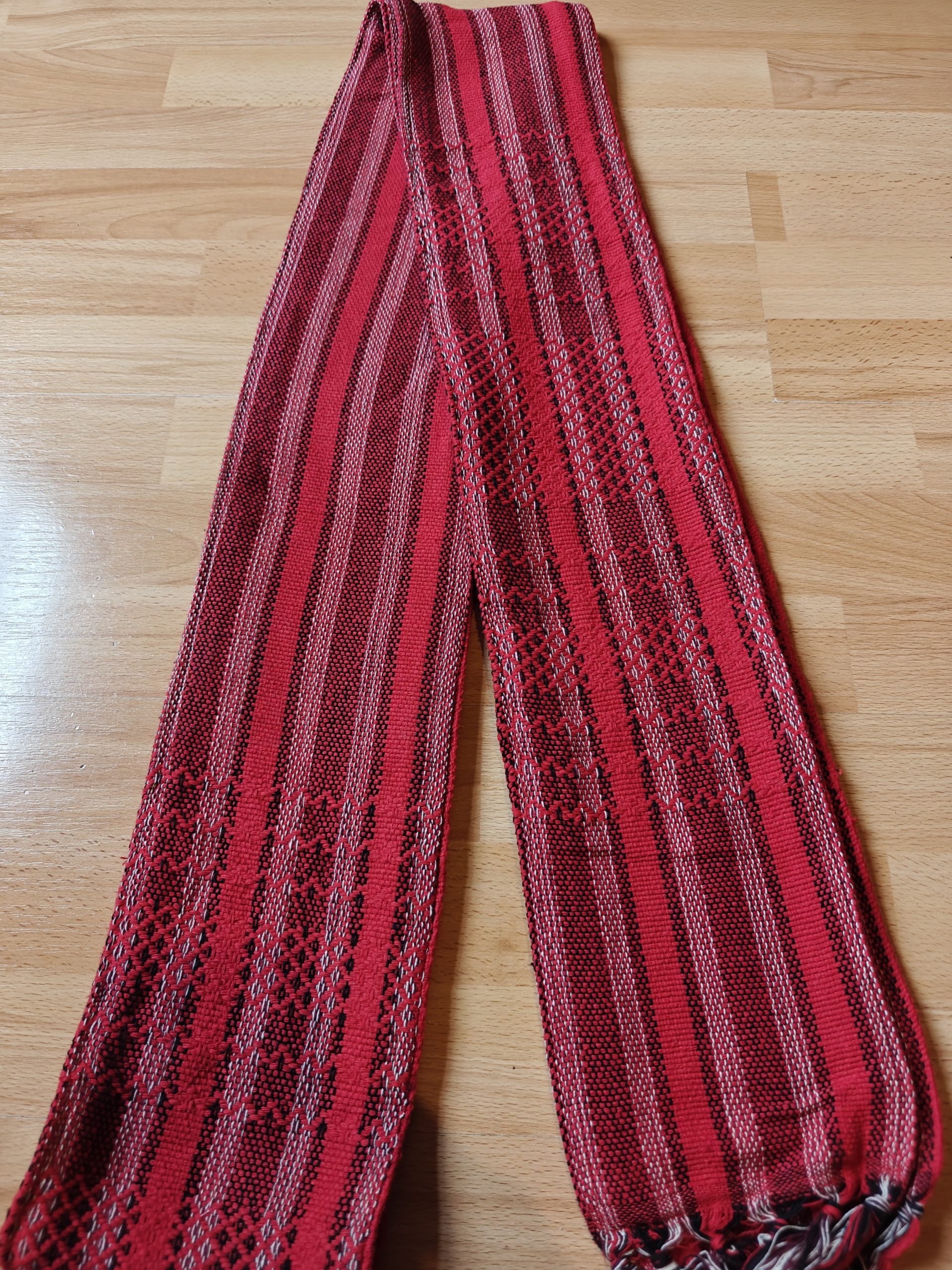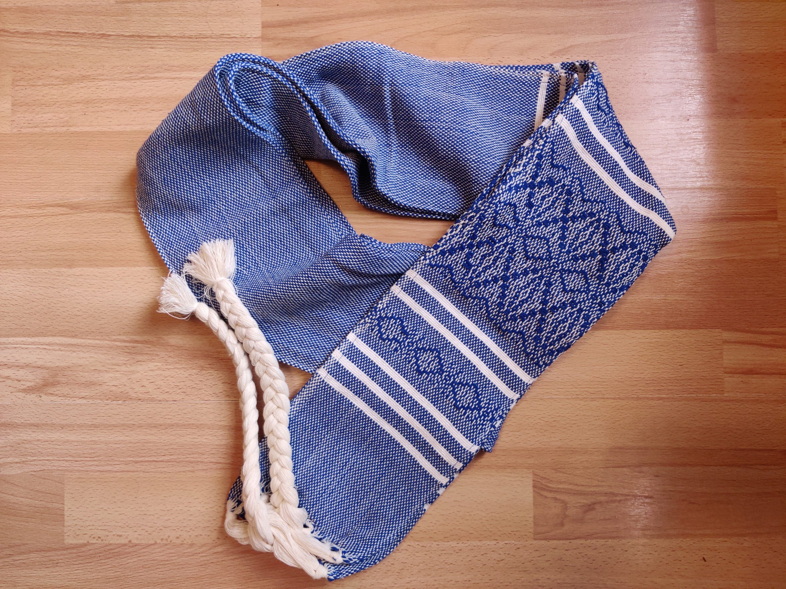 The length is around 2.8m, plus the plaits/fringes (which make tying easy), and around 15cm wide. These ones are quite heavy: they weigh around 550-600g.