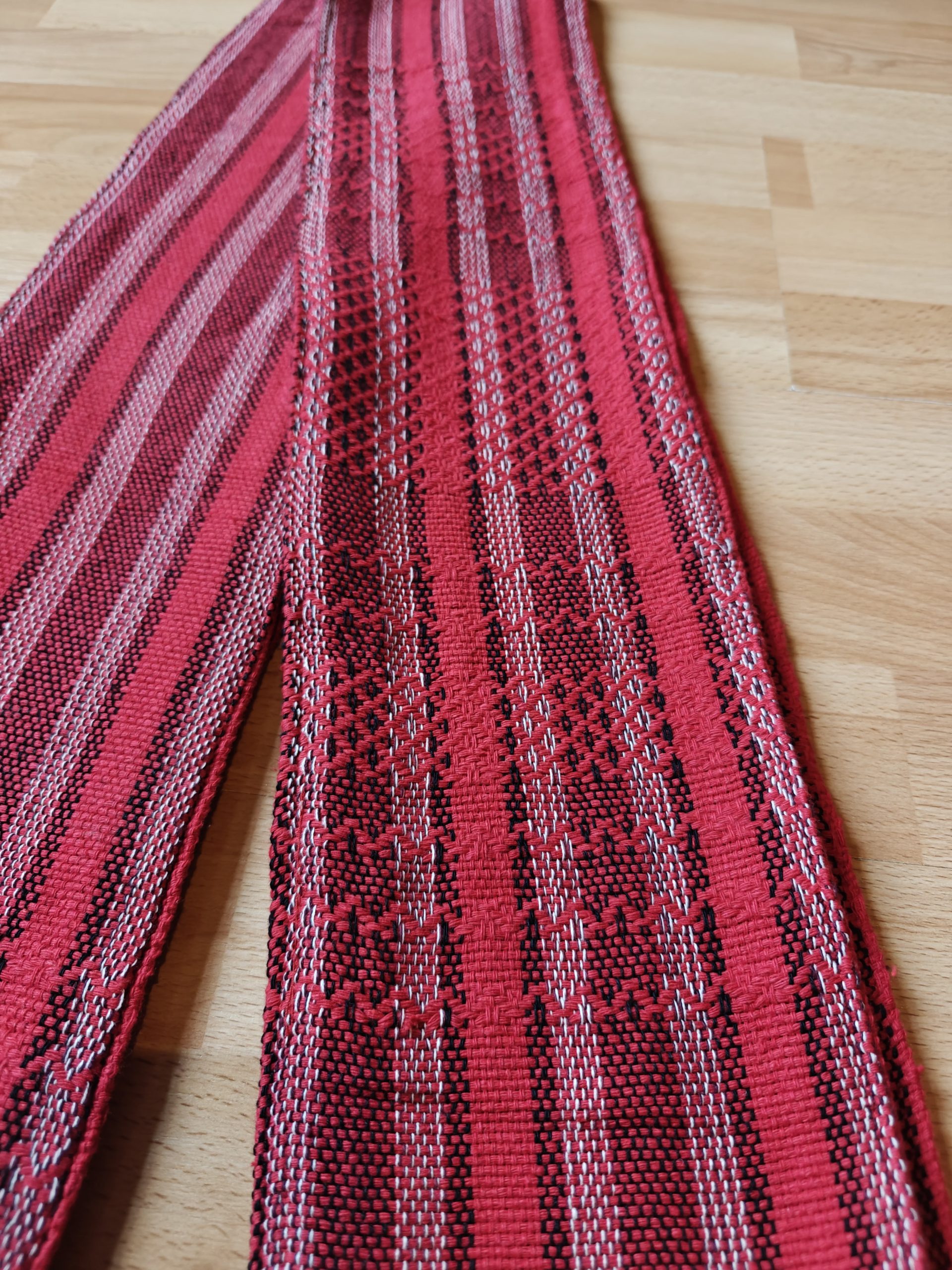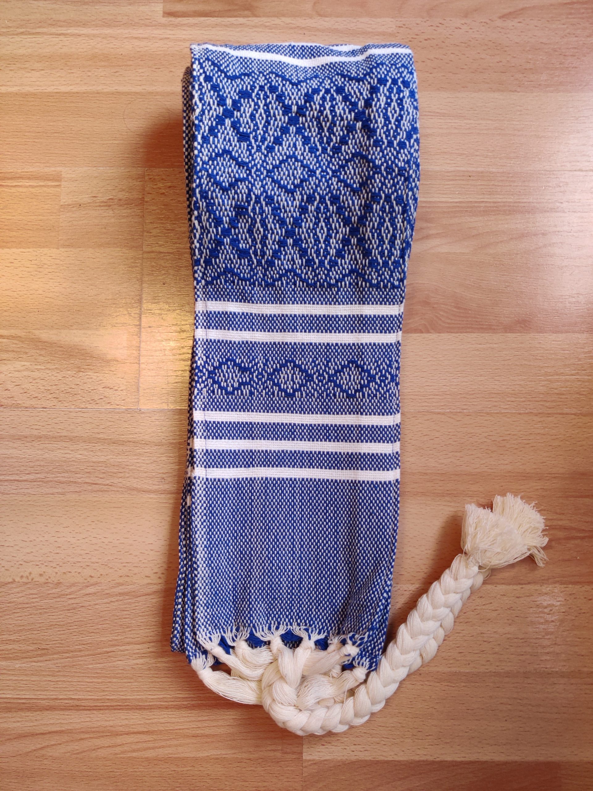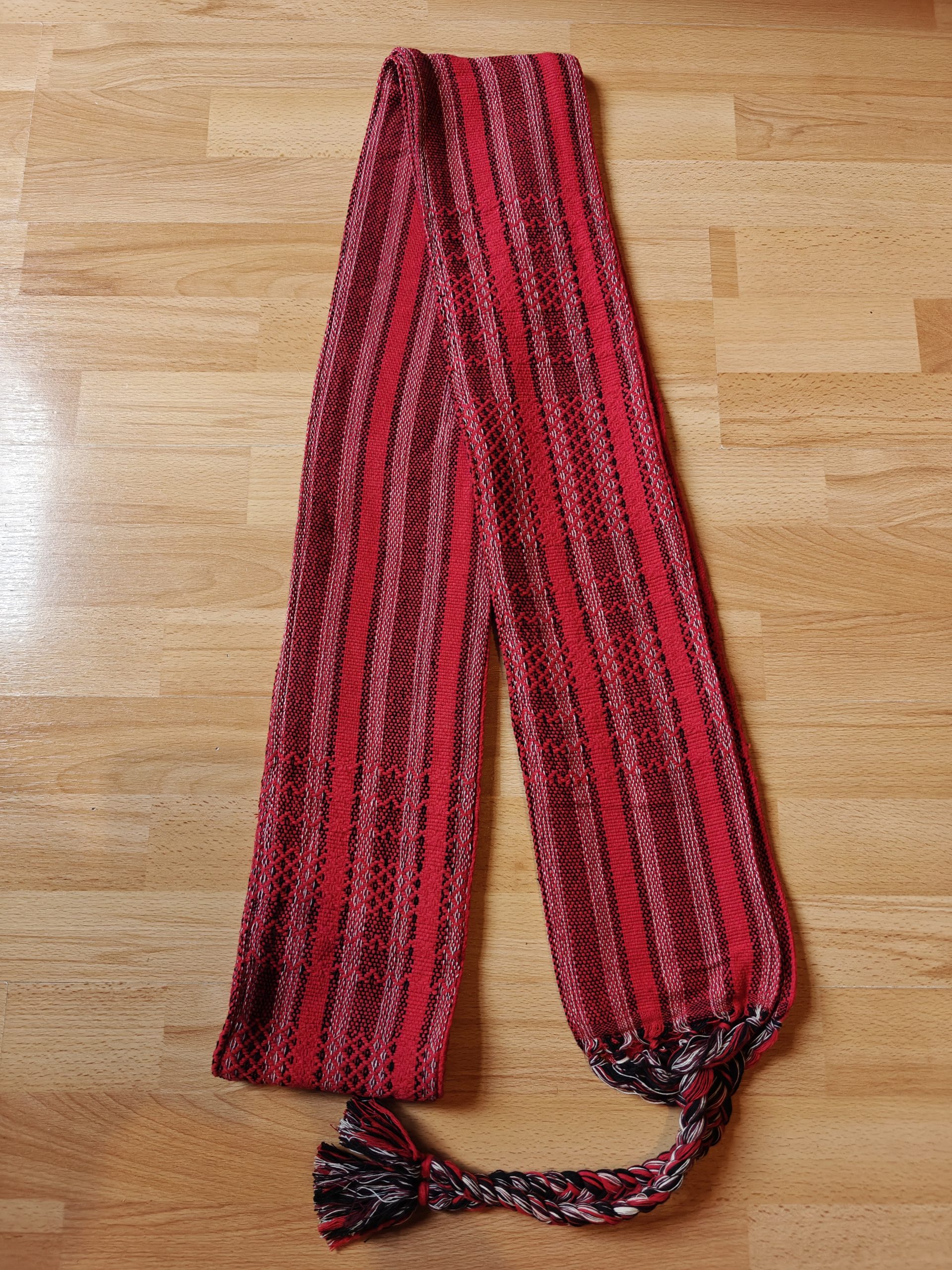 The length is around 2.8m, plus the plaits/fringes (which make tying easy), and around 15cm wide. These ones are quite heavy: they weigh around 550-600g.