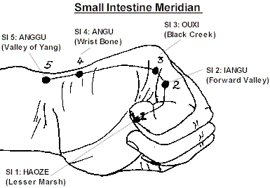 The path of the SI meridian runs as follows: it starts where the Heart meridian (its Yin pair) finishes, namely in the outer tip of the little finger. It then runs along the back edge of the hand, through the wrist, upward along the outer forearm and upper arm, to the shoulder. After zigzagging along the back of the shoulder it meets the Governor Vessel meridian which runs along the center of the back. Here it branches, with a first branch going inside the body and descending through the heart, diaphragm and stomach before ending in the small intestines. A second branch ascends along the side of the neck to the cheek and outer corner of the eye, from where it goes to the ear. A third small branch leaves the cheek to run to the inner eye, where it meets the Urinary Bladder meridian.